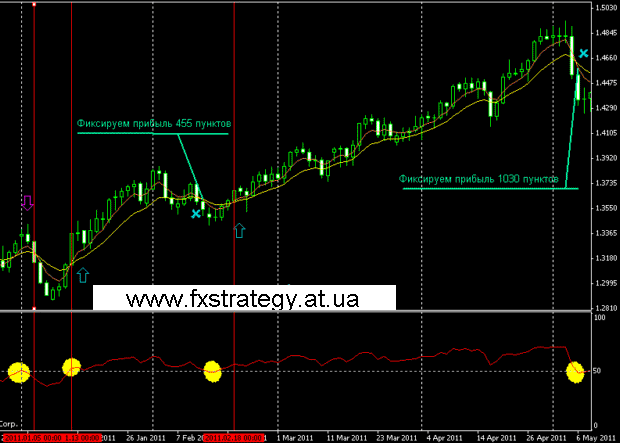 Очень простая, но от этого не менее эффективная и прибыльная торговая стратегия. Для определения момента входа в рынок и выхода из него достаточно одного взгляда. Эта торговая стратегия подойдет для тех трейдеров, у которых очень напряженный график работы и они попросту не могут целыми днями сидеть и следить за динамикой изменения цены.